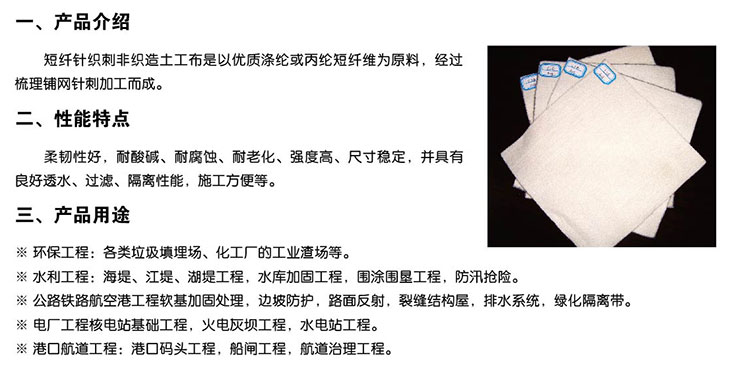 5、短纖土工布產(chǎn)品不含化學添加劑,也不經(jīng)熱處理,是環(huán)保型的建筑材料。